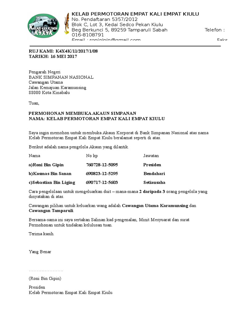 Contoh Surat Permohonan Membuka Akaun Kelab Pdf
